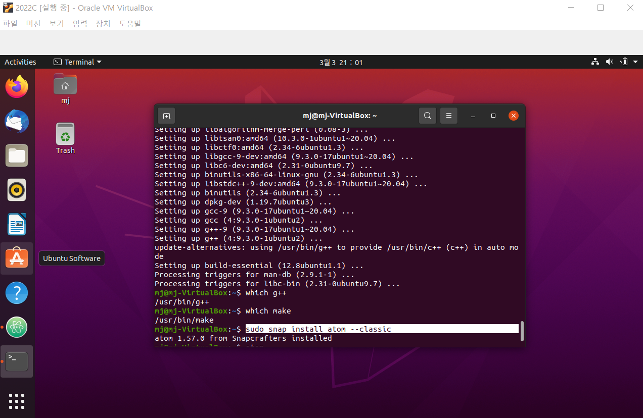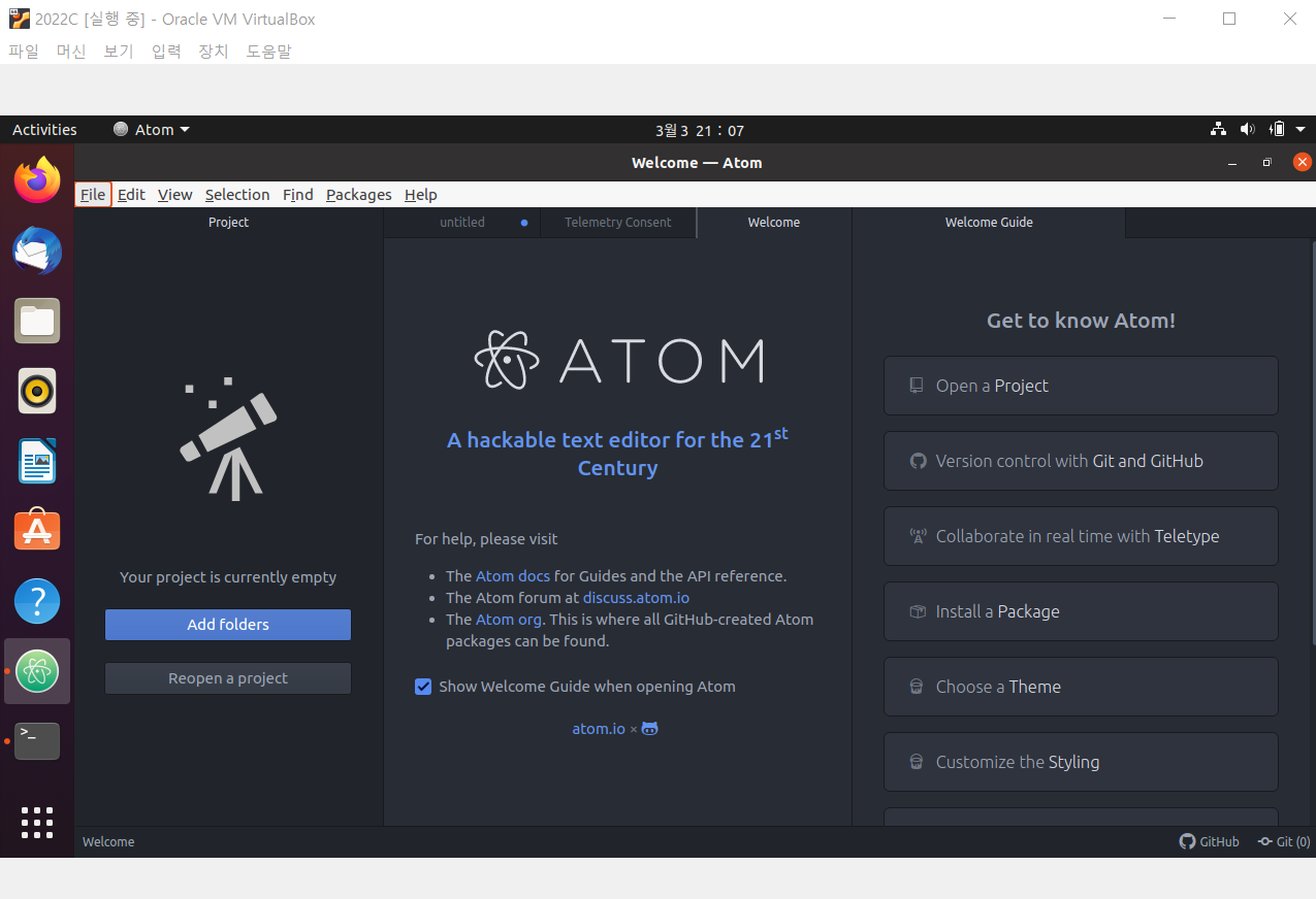 virtual box로 실행한 ubuntu 에서 atom을 써야할 일이 생겼습니다.