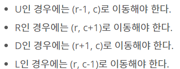 크기가 N×M인 미로가 있고, 미로는 크기가 1×1인 칸으로 나누어져 있다. 미로의 각 칸에는 문자가 하나 적혀있는데, 적혀있는 문자에 따라서 다른 칸으로 이동할 수 있다. 어떤 칸(r, c)에 적힌 문