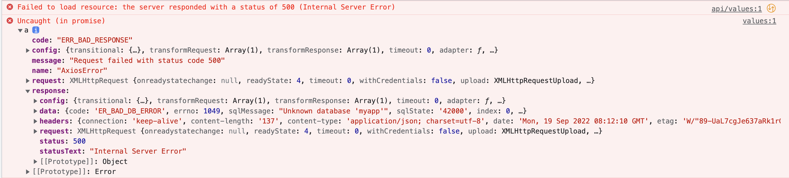 data: {code: 'ER_BAD_DB_ERROR', errno: 1049, sqlMessage: "Unknown database 'myapp'", sqlState: '42000', index: 0, …}